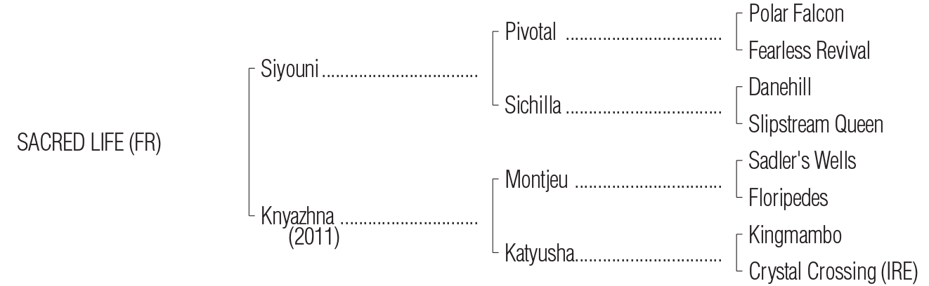 KNYAZHNA, by Montjeu. Unraced. Dam of 7 registered foals, 6 of racing age, including a 2-year-old of 2022, 4 to race, 3 winners-- SACRED LIFE (FR) (r. by Siyouni). Black-type winner, see record. Khagan (g. by Le Havre). Winner at 3, €54,300, in France, 2nd Prix du Lys [G3], etc.; winner at 5, £7,627, in England. (Total: $71,332). Savoureuse (f. by Siyouni). Winner at 2, placed at 3, 2022, €16,800, in France. (Total: $18,568).